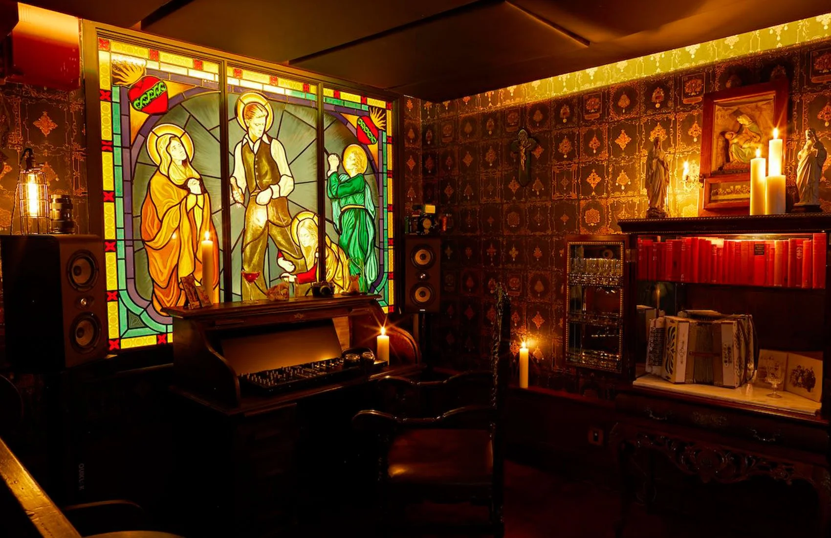 The basement studios all have their own unique and immersive themes which will no doubt lend a certain character to the music made inside: There is a ‘Kyoto Room’ styled like a 19th century Chinoiserie parlour and the ‘Seminary’ studio with its low-lit and churchy atmosphere, which is adorned with a stained-glass mural of David Bowie surrounded by doting saints.
