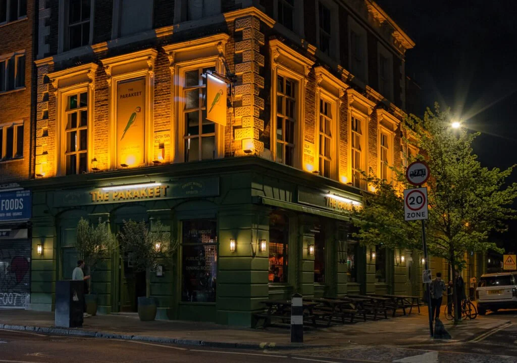 Head to Kentish Town for a memorable Sunday roast at the picturesque Parakeet Pub. Immerse yourself in the ambiance of pistachio-colored booths, wood-paneled walls, stunning stained glass windows, and captivating paintings by Ghanaian artist Theophilus Tetteh.